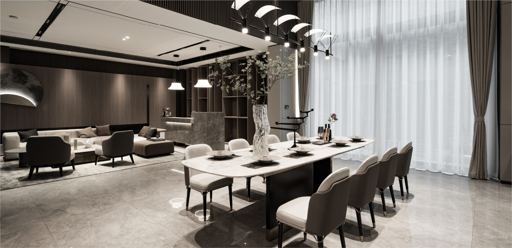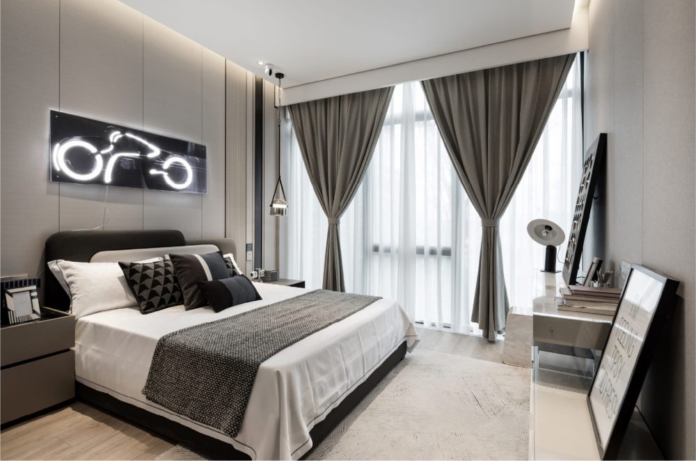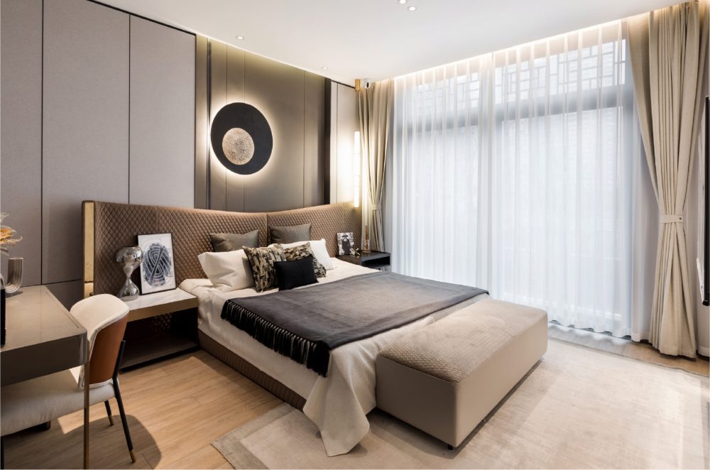 内装空间采用亚厦装配式产品,选用无甲醛环保健康专利集采,从源头上解决了装修污染问题,饰面层应用了真丝墙布等多元材质,提供了真正无醛、科技、品质的健康住宅,打造高端人居新体验。