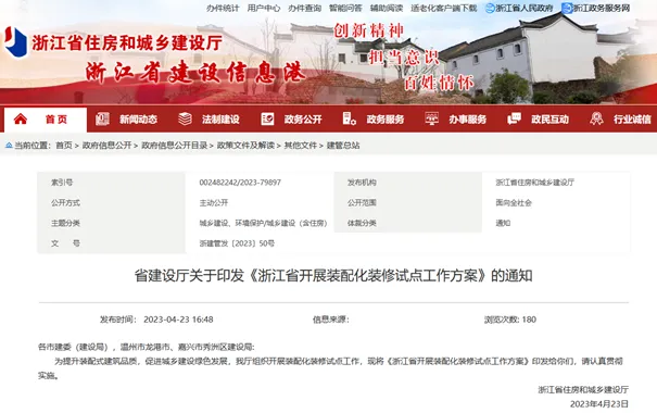 浙江省建设厅 | 印发《浙江省开展装配化装修试点工作方案》
