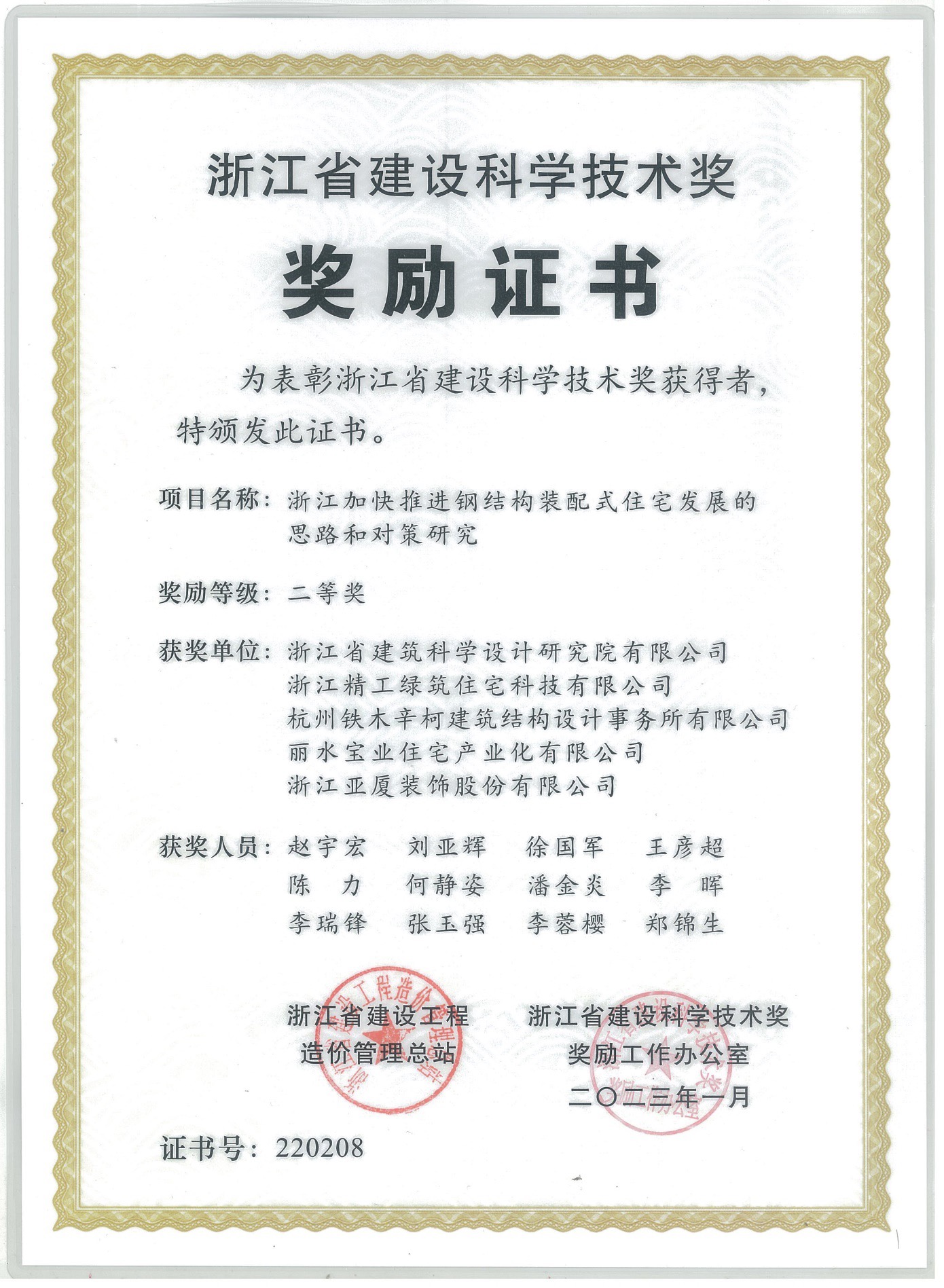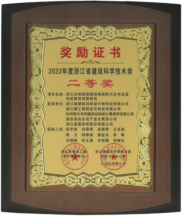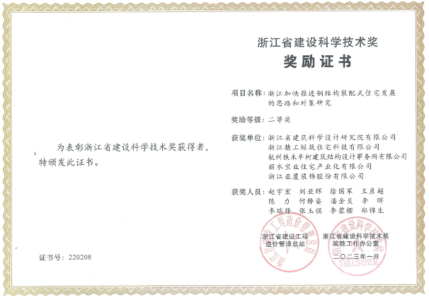 日前,经专业组初评、评审委员会评审和奖励委员会审定,浙江省建设科学技术奖励工作办公室公布了“2022年度浙江省建设科学技术奖”获奖名单,亚厦装饰与浙江省建筑科学设计研究院有限公司等单位合作研发的浙江省建设科研项目“浙江加快推进钢结构装配式住宅发展的思路和对策研究”荣获“2022年度浙江省建设科学技术奖二等奖”。