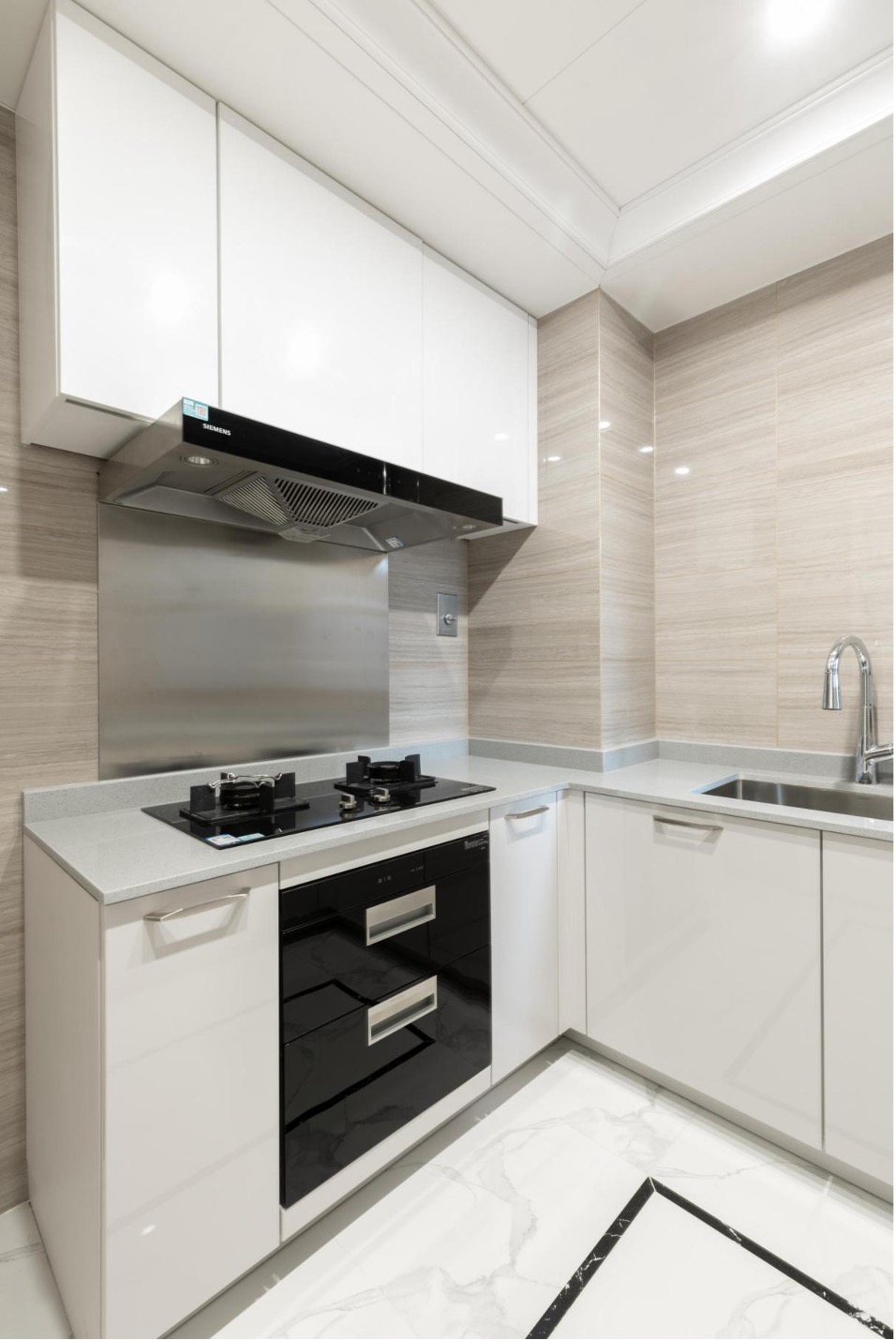 厨房采用亚厦工业化装配式瓷砖亚镁墙面板,通过超精贴合热压技术合成,防水防潮性能优异,同时能有力抗冲击,减少变形。