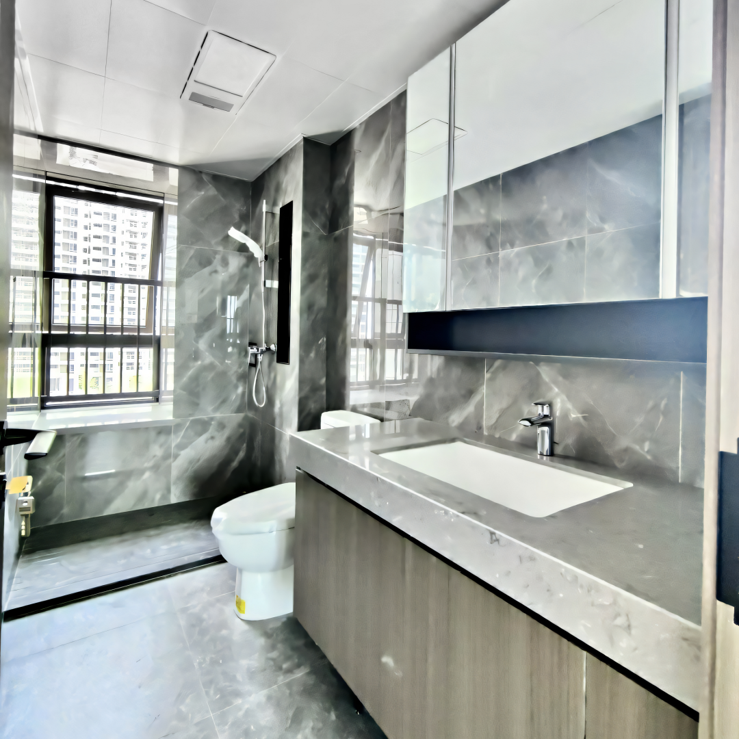 卫生间则通过封闭式防水底盘技术及一体式复合墙板插接技术,构成“零渗漏”的卫浴防水体系,墙面通过卡插式安装结构,拼接处插入柔性防水胶条材料与构造双重防水,杜绝渗漏隐患。