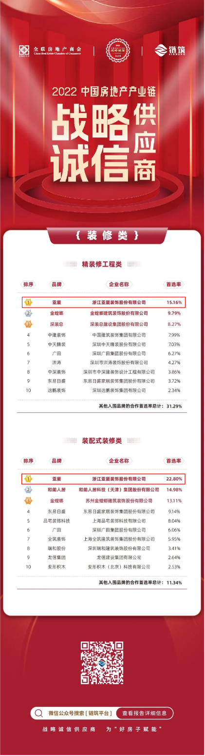 2月25日,由全国房地产商会、链筑分会联合主办的“大变局与新未来”中国房地产产业链战略创新峰会暨2022年度盛典在北京举办,会上发布《2022中国房地产产业链战略诚信供应商研究报告》。亚厦凭借领先的综合实力及优质服务口碑荣誉上榜,同时荣膺“装修类”中“精装修工程类”和“装配式装修类”榜单第一名。